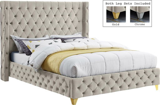 Savan Cream Velvet Queen Bed - Rich Cream Velvet - Deep Button Tufting - Gold and Chrome Legs Included with Each Bed - Full Slats (No Box Sprin...