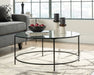 Giving your home a sophisticated new look has never been easier. Create a one-of-a-kind aesthetic in your home with the simplistic design and charming good looks of this round coffee table from the Harvey Park collection. This stunning coffee table features a uniquely designed round surface with a safety-tempered glass top that is sure to stand out. Its spacious top surface provides you with all the room you need for all your couch side necessities like a place to set the TV remote, hold your snacks, store magazines and of course a place for your hot cup of coffee! It also makes a great spot to display your array of home décor items like indoor plants, knick-knacks and photos of your family and friends. You can find a place for all your things! Its finished on all sides for versatile placement throughout your home to ensure that it looks great from any angle. Finished in Black with a durable metal construction, this attractive coffee table is just what you've been looking for.
