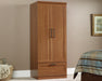 The perfect blend of style and functionality. This wardrobe/storage cabinet from the Sauder Select collection is just what your home has been looking for. Behind its two framed panel doors, this tall storage cabinet features a garment rod for hanging blouses, sport coats, winter jackets, light sweaters, and more. This storage armoire includes an adjustable shelf for customizable storage options and holding your shoe boxes, organizing bins, or stacks of towels and linens. An easy gliding storage drawer creates a convenient space in this wardrobe cabinet for bed sheets, seasonal wear, denim, and more. Adjustable levelers ensure that your storage cabinet will be level, even if the floor is not. An enclosed back panel with cord access allows for an easy path for charging cords, creating a convenient way to charge you tablet, smart phone or watch. Finished in Sienna Oak, this handsome wardrobe armoire is the solution to all your clothing storage woes.