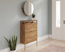 An organized entryway makes for a happy place. Use this shoe cabinet with mirror to get your entryway neat and tidy without sacrificing the style you love. This two-piece solution includes a wall-mounted shoe storage cabinet and mirror from the International Lux collection to save floor space while providing hidden organization. For foyer shoe storage, the cabinet features two tilt-out doors that conceal storage compartments. Display decorative plants, framed photos, or a candy dish on the top shelf and use the shelf underneath to store keys, wallet, or cell phone. Keep everything tidy and in one place. In addition to the entryway shoe storage cabinet, more concealed areas – including a shelf and four hanging hooks – can be found behind the mirror. With strategic positioning at the entryway, this mirrored shoe cabinet combination gives a convenient place to check your look before you head out the door. Finished in Sindoori Mango and accented with a powder coated metal frame for durability, this slick entryway organizer will have your home looking and feeling in tip-top shape in no time.