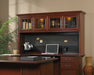 Create a stunning focal point while increasing the storage capabilities in your home office or workspace with this hutch from the Heritage Hill collection. This handy hutch features four framed, safety-tempered glass doors that are each detailed with an etched line design that adds an extra touch of sophisticated style that is sure to stand out. Behind each set of doors is a spacious compartment that includes a display light for you to illuminate and show off all your belongings. It is an ideal space for you to store and display anything from work binders and your collection of books to awards and your most prized possessions. You can find room for it all! Its fabric-covered corkboard back panel is ideal for posting and hanging up important notes and reminders. It also features a slat wall section that includes a CD holder, pencil cup and folder sorter tray. This hutch easily attaches to Executive Desk 109843 with 48" Return Kit 109848 and optional 72" U-Shaped Connector Kit 109872. It is important to note that this hutch will not attach to the executive desk alone. Finished in Classic Cherry, this beautiful hutch will enhance the look of your office space.
